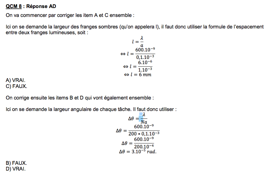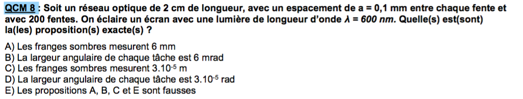 Si l'on regarde en détail le calcul il n'y a pas le multiplié par 2 (au numérateur) pour la formule de l'intervalle angulaire dans le cas d'un réseau optique.
