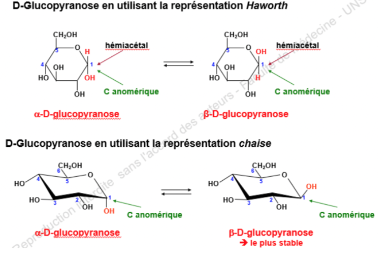Les anomeres ici ne vont se différencier que par la configuration du carbone anomerique ( carbone portant le OH qui sera dirigé vers le haut ou le bas ) ->
