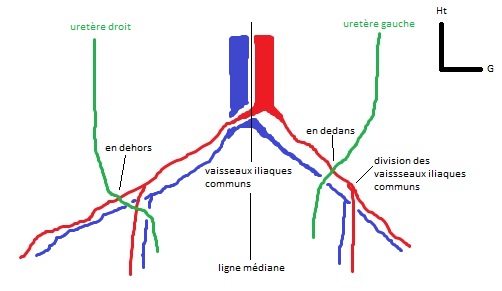 Je rajoutes un truc: si les uretères ne passent pas au-dessus des mêmes vaisseaux, c'est tout simplement parce que l'aorte abdominale est décalée sur la gauche par rapport à la ligne médiane, si bien que toutes les divisions seront décalées vers la gauche. Essayez de vous imaginer que si il n'y avait pas ce décalage vers la gauche de l'aorte abdominale, lest uretères passeraient pile en regard de la division iliaque. Et maintenant, avec votre imagination, laissez les uretères où elles sont, et déplacer l'ensemble du bloc vasculaire (de l'aorte abdominale jusqu'aux artères iliaques externes) vers la gauche, vous aller voir, les uretères se mettent toutes seules à leur place !