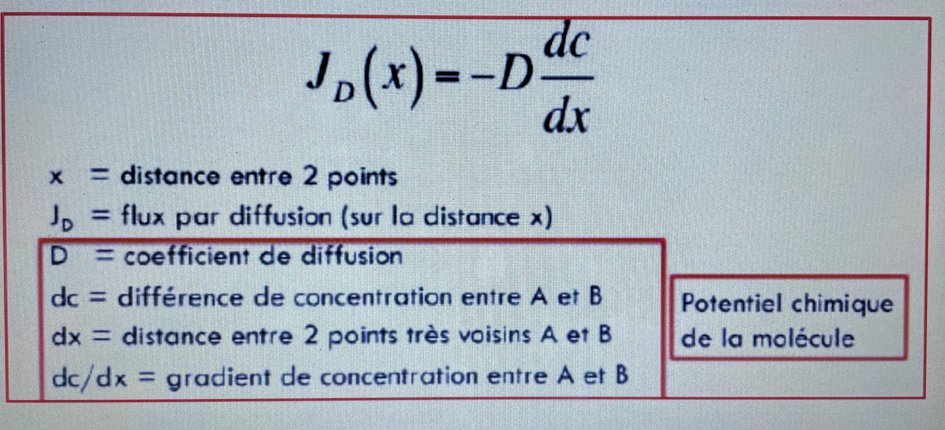 :arrow: Comme vous pouvez le voir sur la photo effectivement le flux de diffusion Jd est proportionnel à la différence de concentration entre deux points (dc est au numérateur au niveau de la fraction) mais bien INVERSEMENT proportionnel à la distance séparant ces deux points (dx qui est au dénominateur de la fraction).