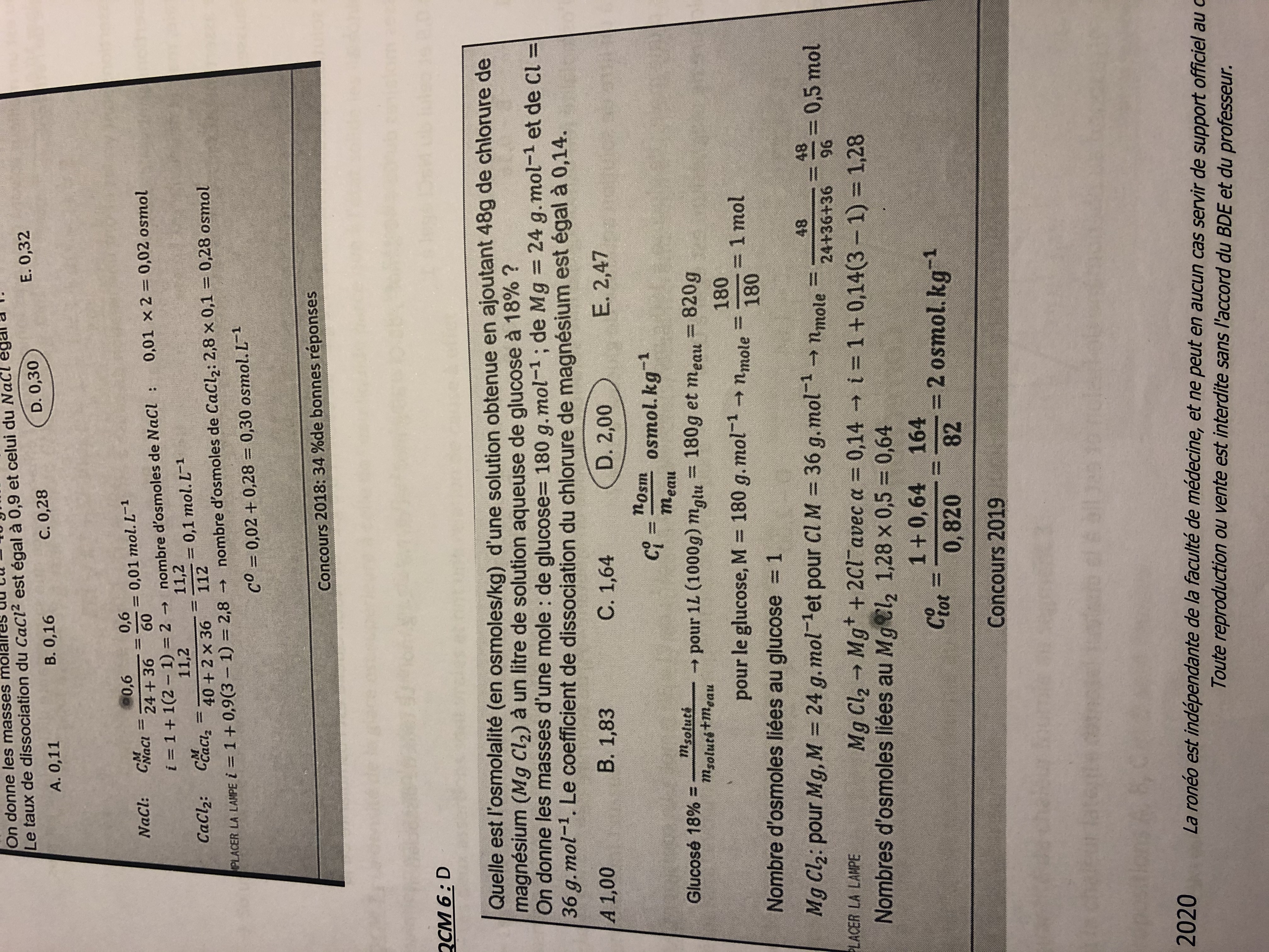Déjà de base ce qui m'a interpellée c'est le fait qu'on demande l'osmolaRité alors qu'à chaque fois que y'a ce type de qcm, c'est toujours le même énoncé et on demande à chaque fois l'osmolaLité. J'ai essayé, et je tournais en rond mdrr du coup je vais voir la correction et la méthodologie utilisée était exactement la même qu'à chaque correction de ce genre de qcm : calcul de n (mole) puis multiplication par i et on trouve osmolalité en osmole/kg (osmolarité ici du coup). Et j'avoue que je comprends pas trop puisque j'ai l'impression que même dans la correction on nous parle d'osmolaLité.