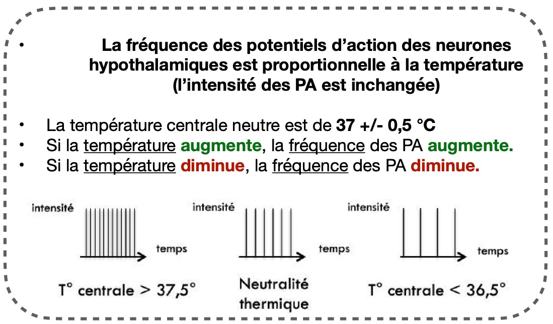 La fréquence des potentiels d’action des neurones hypothalamiques est proportionnelle à la température, et l’intensité des PA est inchangée.