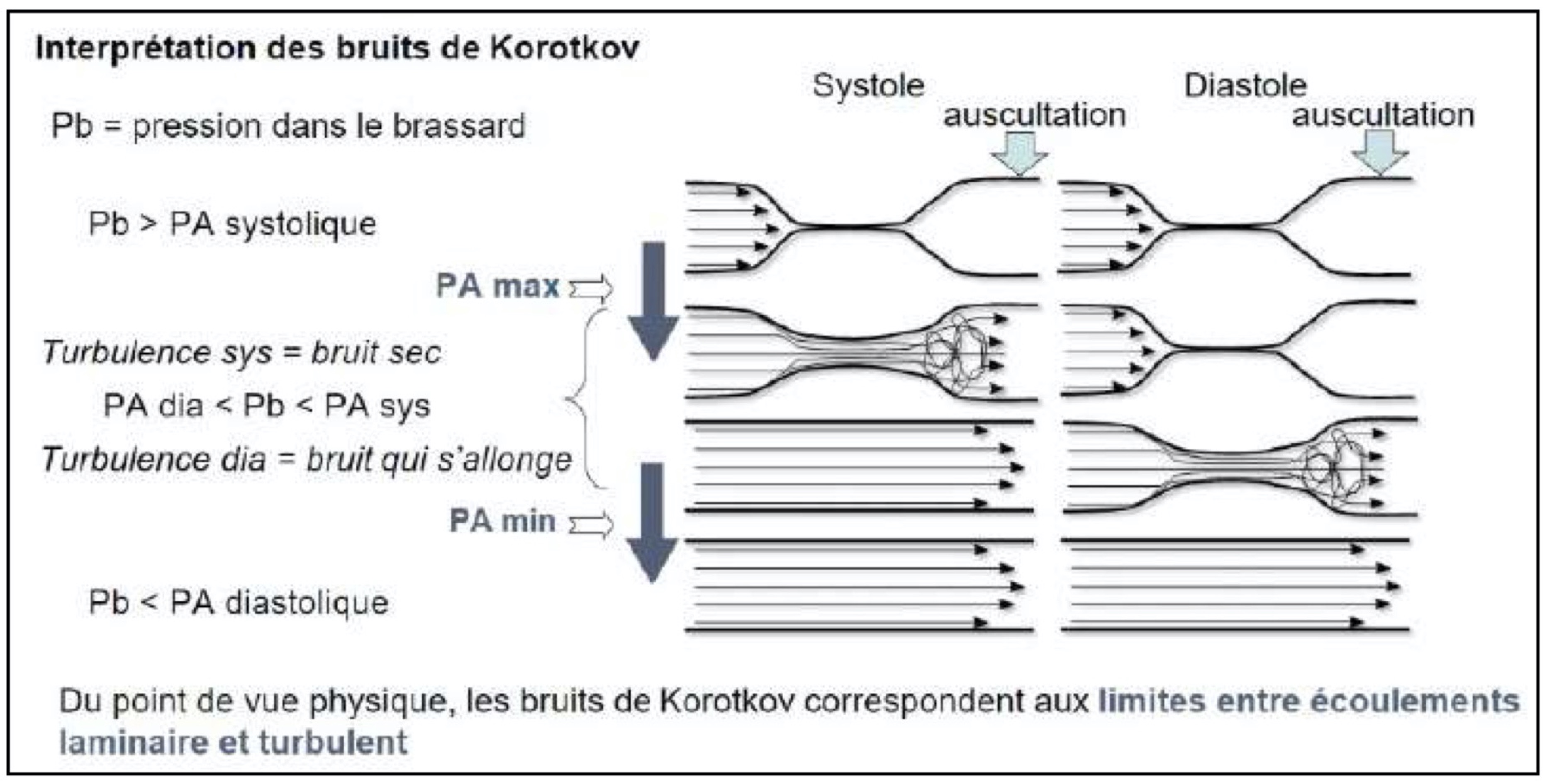 :arrow: FAUX : rien à voir, lorsque la pression du brassard devient inférieur à la PAmin on n'entend plus rien car l'écoulement est redevenu laminaire en systole ET en diastole.