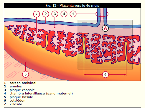 On voit bien la plaque choriale ( en rose) du côté du cordon ombilical = côté BB, et à l'opposé, la plaque basale de la mère !