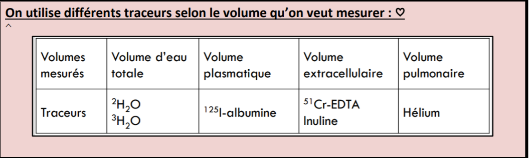 :arrow: Par exemple on considère que l'eau n'est pas vraiment renouvelée dans le corps donc son traceur (deutérium ou tritium) est séquestré. Vu que ces traceurs sont fait pour mesurer uniquement le volume d'eau (du moins dans le cadre de notre cours en PACES et de ce qui a à retenir pour cette année) on considère qu'ils sont séquestrés dans leur milieu (il sont pas non-séquestré).