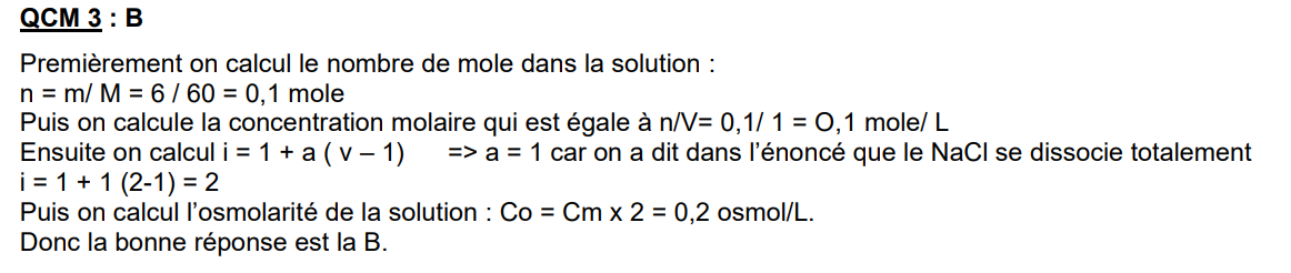 En fait en refaisant les calculs je trouve 0.4 osmoles/l car pour moi il y a une mole de Na et une autre mole de Cl dans les 6 g. Ce qui donne la molarité de 0.2 mol/L