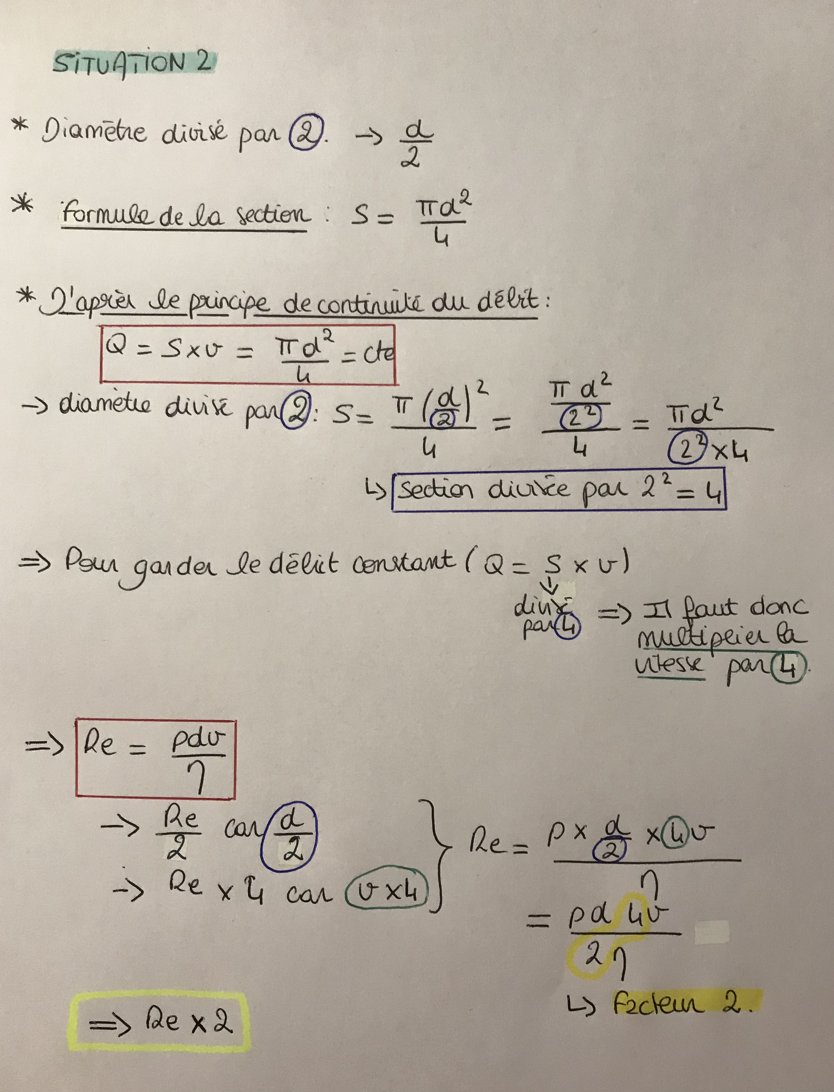 B) En situation 2, la vitesse de circulation est augmentée d’un facteur 4 C) En situation 2, le nombre de Reynolds est augmenté d’un facteur 4 D) En situation 2, le régime est instable