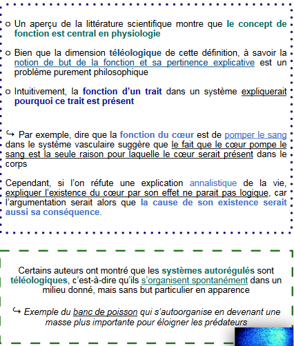 Mais dans l'exemple dessous, on dit que les systèmes autorégulés s'organisent spontanément sans but particulier et que c'est la téléologie, alors que ca semble contradictoire avec ce qui a été dit juste avant vu que l'existence d'un trait dépend de sa fonction.