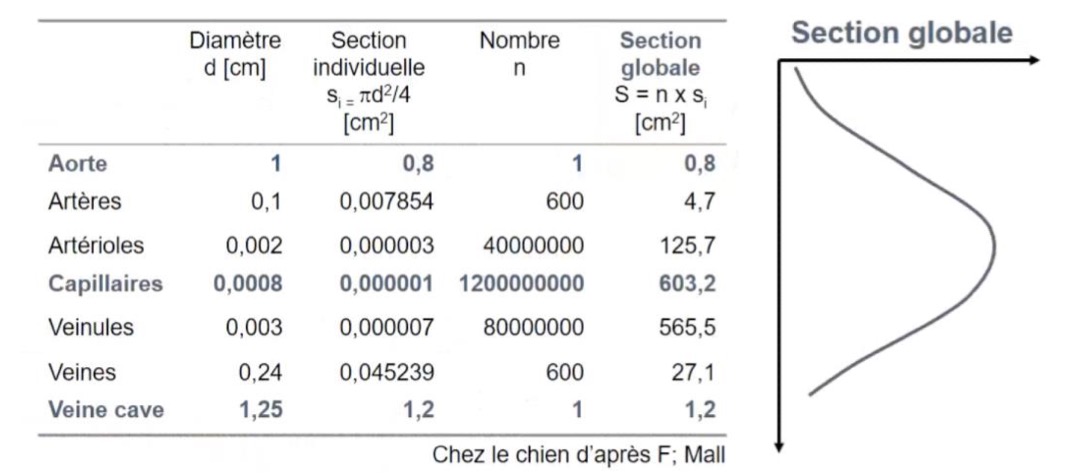 Oui au fur et à mesure du réseau vasculaire jusqu'aux capillaires, les vaisseaux se ramifient et deviennent de plus en plus petit (la section individuelle diminue), mais il y a aussi beaucoup plus de vaisseaux (la section globale augmente) (Des capillaires vers la veine cave, on observe l'inverse cf. schéma + loin)