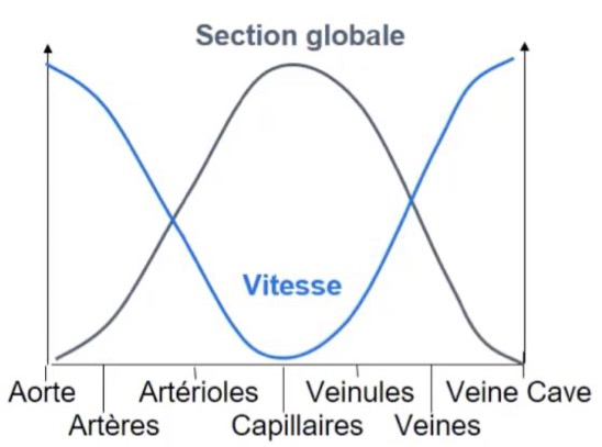 Au niveau des capillaires on a bien une section globale maximale pour un vitesse d'écoulement minimale. (cf. garder un débit constant)