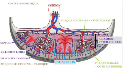 Traduction : Les septums ne sont pas complet, le sang maternel circule entre les différents cotylédons = le placenta est