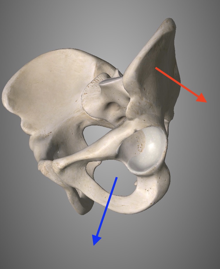 Voilà comment il faut regarder l'os coxal pour se rendre compte des directions vers lesquelles regardent les pâles supérieures et inférieures :