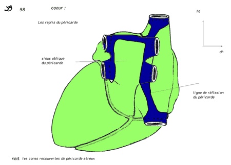 Tu vois sur le schéma que le péricarde, représenté en vert, enveloppe le coeur, et là où il s'arrête de l'envelopper, ça dessine une ligne que j'ai représenté en rouge ci-dessous : c'est la ligne de réflexion péricardique