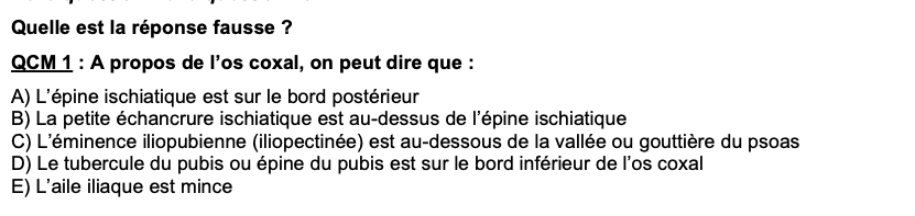 À propos de ce QCM dont le sujet demandait les FAUSSES, pourquoi l'item B est compté vrai, pour moi la petite échancrure ischiatique est au dessous de l'épine ischiatique non ?