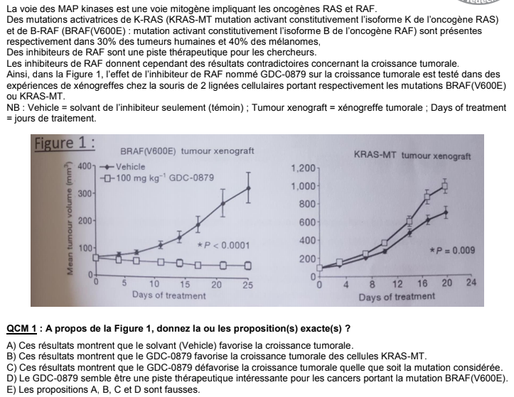 la croissance tumorale n'est pas inhibée et le volume tumoral augmente. Dans ce cas, on peut suggérer en tant qu'hypothèses que soit c'est le solvant (Vehicle) lui-même qui favorise la croissance tumorale ou soit c'est l'absence d'inhibiteur qui induit cette augmentation ! (on doit vraiment balayer toutes les possibilités quand on analyse des résultats expérimentaux, même si Vehicle n'est qu'un témoin on a quand même traité les cellules avec un solvant qui a pu possiblement avoir un effet sur la croissance tumorale qui sait ?