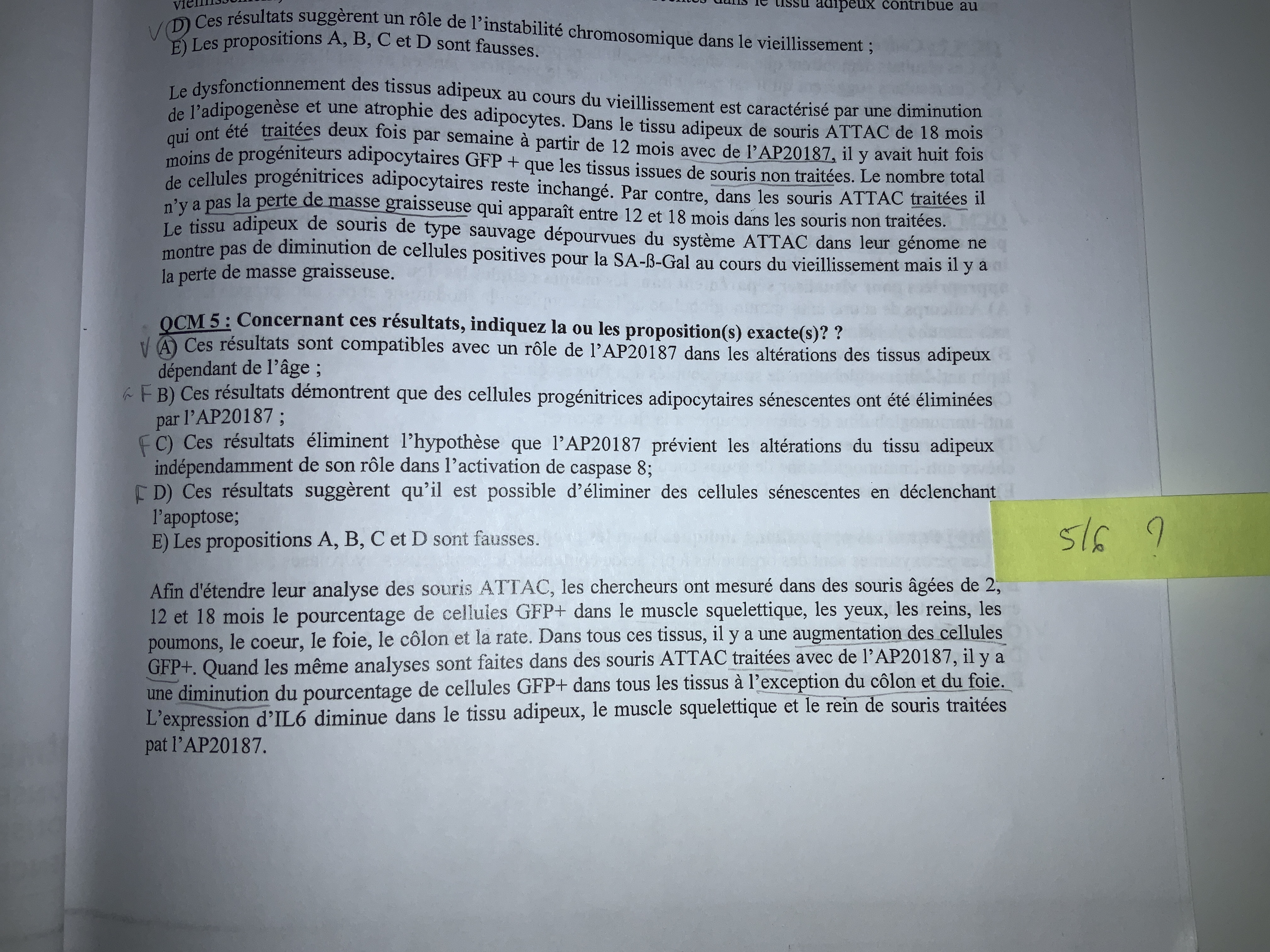 Pour le qcm 6 encore une fois l’expérience n’est faite que sur certaines cellules, pas sur toute c’est pour ça que l’expérience ne peut suggérer que sur certaines cellules, ça ne veut pas dire que toutes les cellules sénescentes ne sont pas résistantes à l’apoptose, juste que l’expérience ne le suggère pas pour tout le monde.