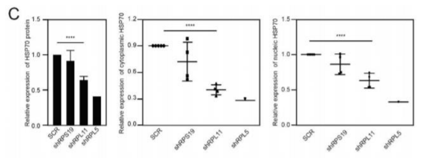 C) En moyenne, pour la mutation shRPL11, on retrouve l’HSP70 en plus grande quantité dans le cytoplasme que dans que dans le noyau