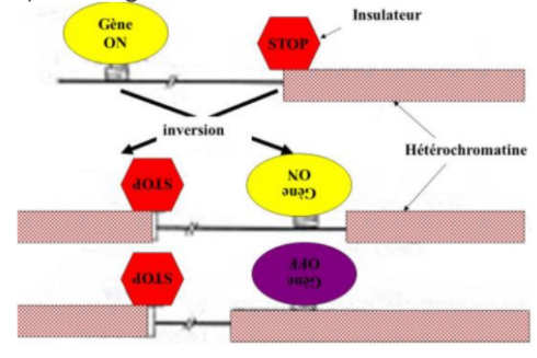 Ainsi, le gène qui était en bas protégé de l'hétérochromatine encore plus bas par un insulateur ne sera plus protégée de l'hétérochromatine en haut suite au retournement ! Et par conséquent l'hétérochromatine pourra se balader jusqu'au prochain insulateur.