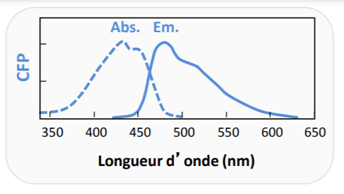J'ai trouvé sur un papier d'ARPEGE, des spécialistes des analyses fonctionnelles et structurales des complexes protéiques (je fais la meuf mais j'ai juste cherché sur google pour illustrer le plus justement mon propos, mais du coup je site ma source), des courbes montrant les faeux spectres de la CFP et de la YFP je te les mets ici ça peut peut-être t'aider à visualiser !