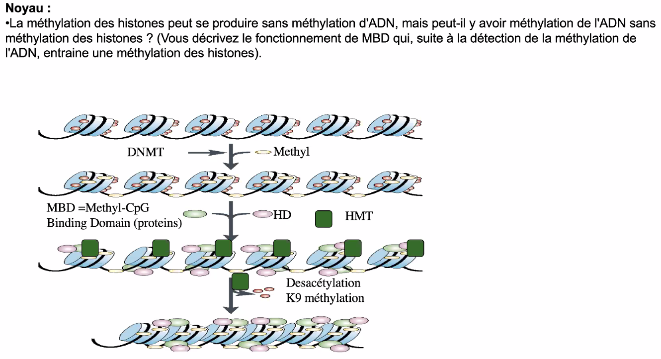 méthylation ADN => reconnaissance par MBD => MBD s'associe à histone méthyl transférase => méthylation lysine 9 de l'histone...., on peut dire que la méthylation de l'ADN est couplée à celle des histones non?