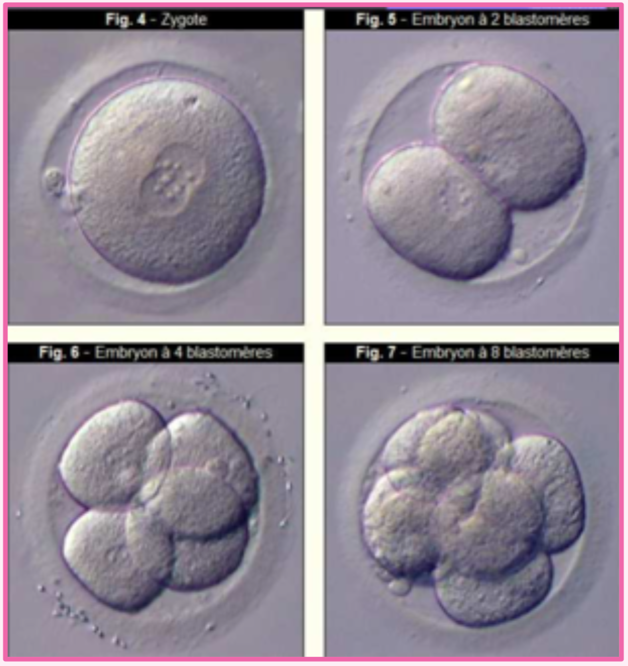 Tu passes d'un zygote qui n'a pas encore effectué sa première mitose, à un oeuf en début de segmentation avec ses 8 premiers blastomères (en bas à droite) !