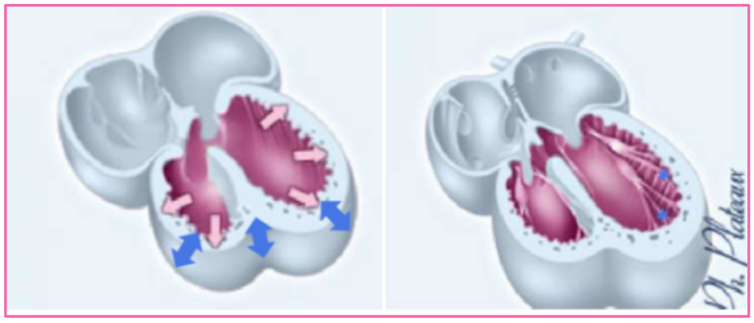 Vous voyez bien sur l'image de gauche le cloisonnement auriculaire n'est pas complet ! Et, en même temps vous avez un épiassisement des parois ventriuclaires (qui se creuseront par la suite pour aggrandir le volume des cavités)