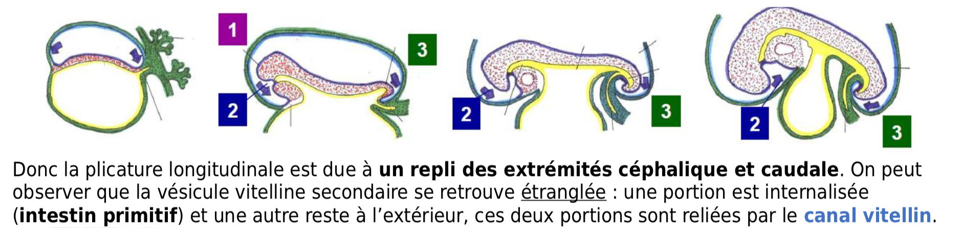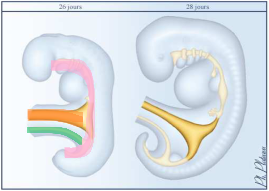 Ce que je t'ai surligné en rose c'est l'intestin primitif, en orange c'est le canal vitellin (donc la partie étranglée de la VVII) et en vert c'est l'allantoide (diverticule de la VVII)