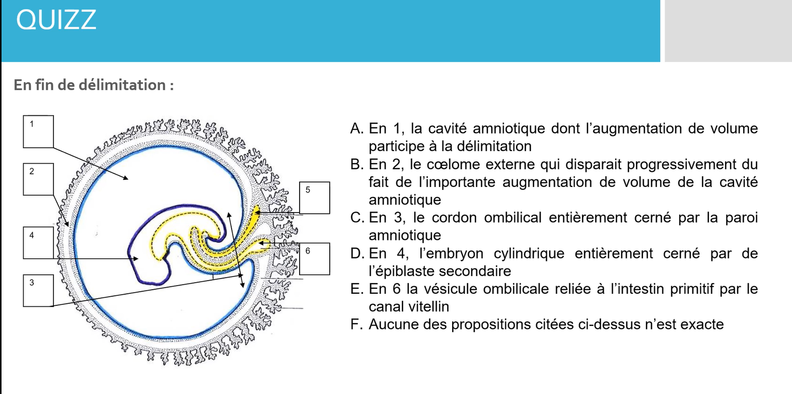 Salut, dans ce QCM, l'item D est conté juste par la prof, mais je comprends pas trop pourquoi, il me semblais que c'était pas de l'épiblaste II au niveau du cordon ombilical... merci de votre aide!
