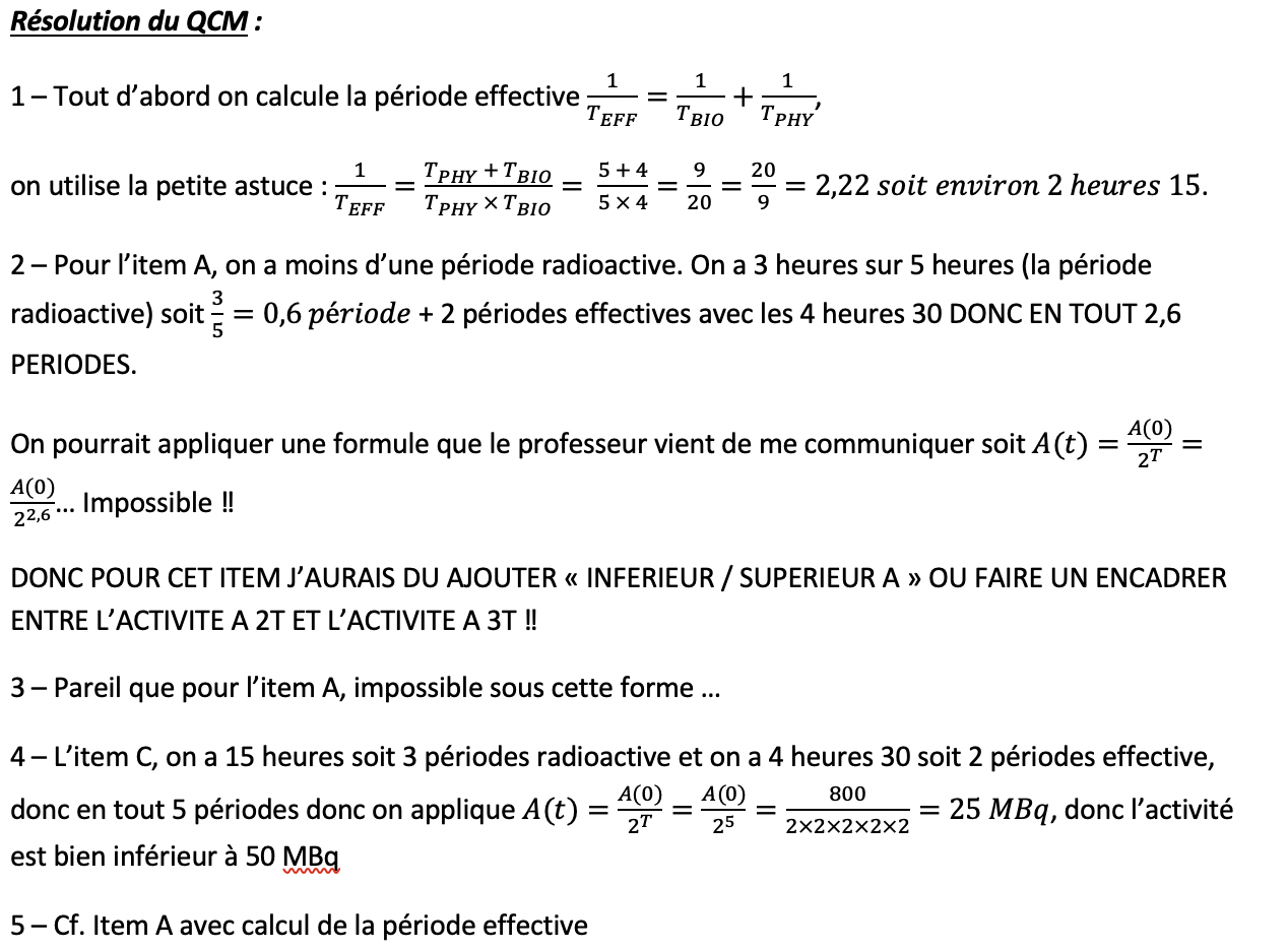 alicecanepa a écrit:Salut j’ai juste une question pour l’item A, dans la correction on nous dit qu’il n’y a aucune période physique qui s’est écoulée mais il y a quand même 3h qui se sont écoulées sur 7h (Trad). J’ai mis l’item A fait parce que je me suis dit que ça pouvait pas être 200 MBq pile étant donné qu’une partie de la période radioactive a été entamée. Donc dans le cas où c’est pas un multiple précis de la période T, on considère que c’est comme si on était à t=0 ?