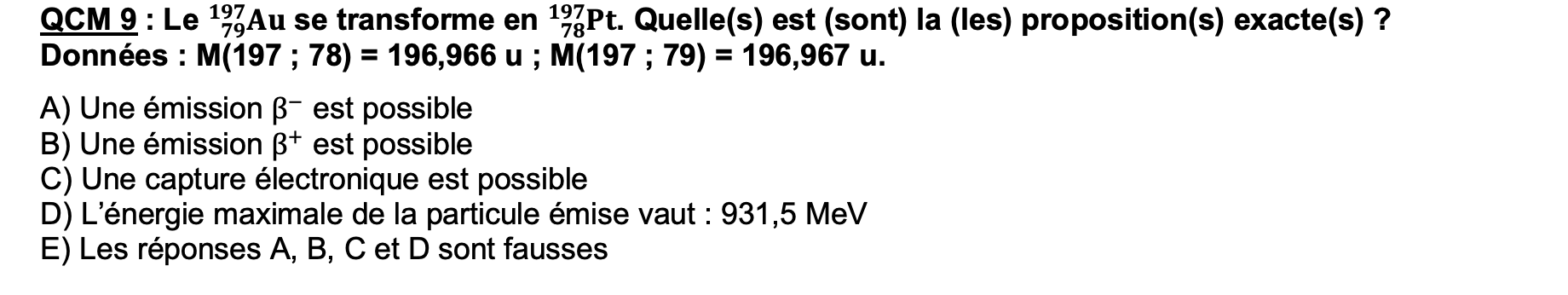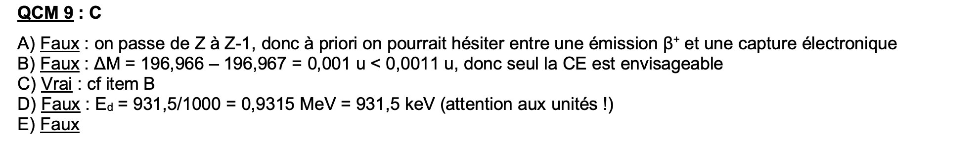 donc 0,002>0,001 donc il y a bien capture électronique donc la réponse du qcm est ABCD dans tous les Annatuts et qcm de Radioactivité que je fais on fonctionne toujours comme ça pour déterminer si il y a une bêta + qui est possible donc je ne comprends pas pourquoi la on ne fait pas comme ça