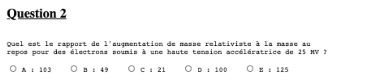 Je croyais devoir utiliser la formule du cours (m = m0 / sqrt(1-v^2/c^2) mais je dois avouer que je n'ai pas réussi :/ (la réponse donnée est la B)
