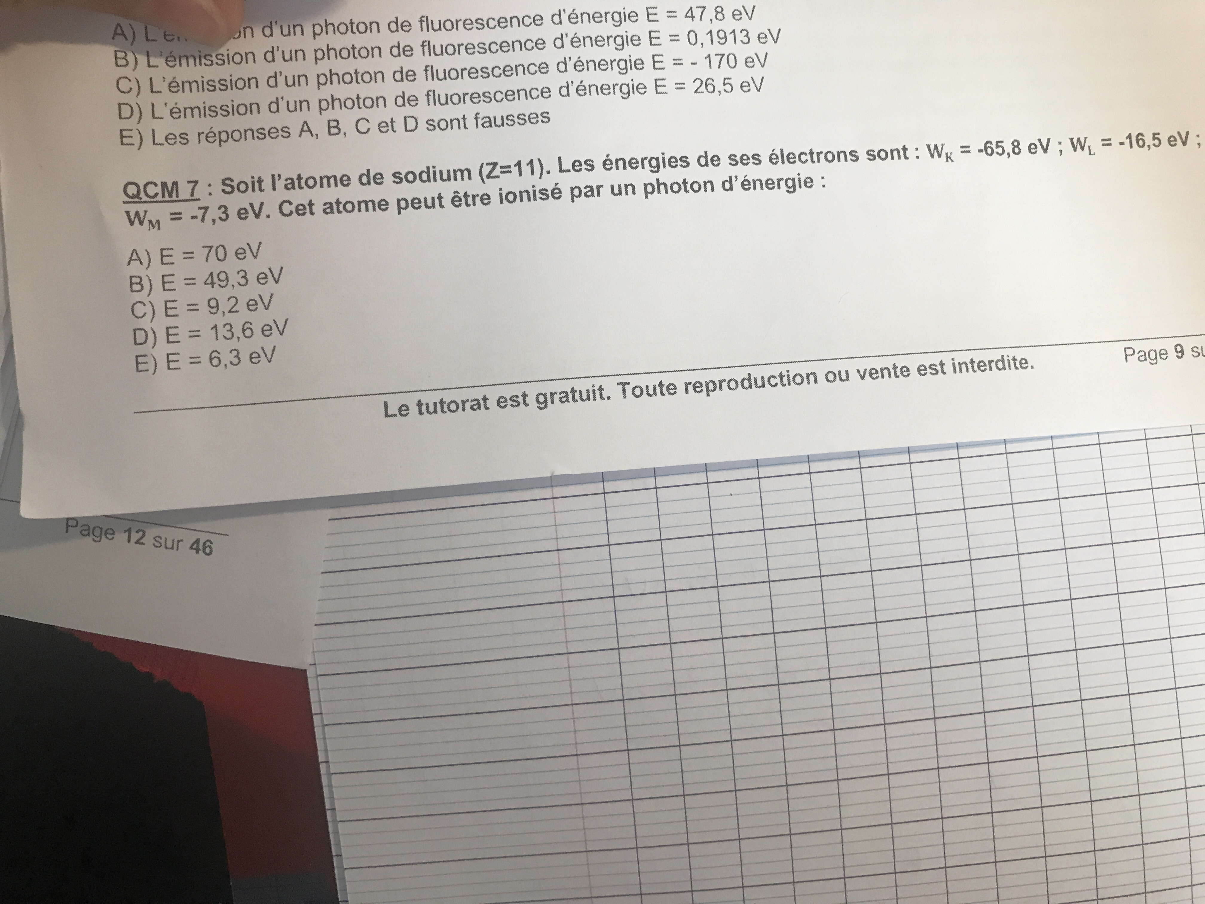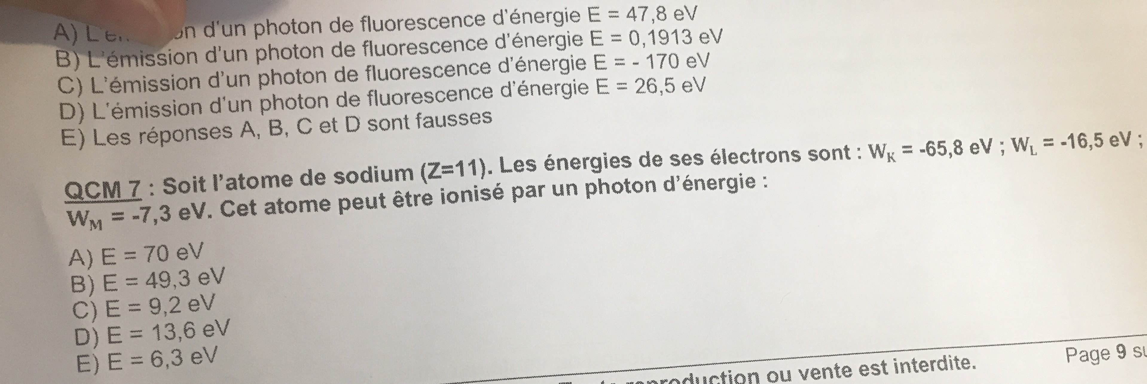 On nous demande pr quelle photon l’atome va être ionisé et on compte la E fausse étant donné que 6,3<7,3 or je me suis dis que pour qu’il n’y ai pas de ionisation il fallais a chaque fois vérifierez que la différence entre les couches fasse la même énergie que le photon qui transporte cet énergie or là en faisant la différence entre les couches l et m j’ai trouvé 9,2 c’est ce qui se rapprochait on va dire le plus de la valeur proposé dans l’item e donc je ne comprends pas que l’orsque l’nergie N’est pas quantifié ( par exemple l’energie De ce photon qui ne correspond pas à une différence d’energie Entre 2 orbitales diff) ça ne provoque pas d’ionisation?
