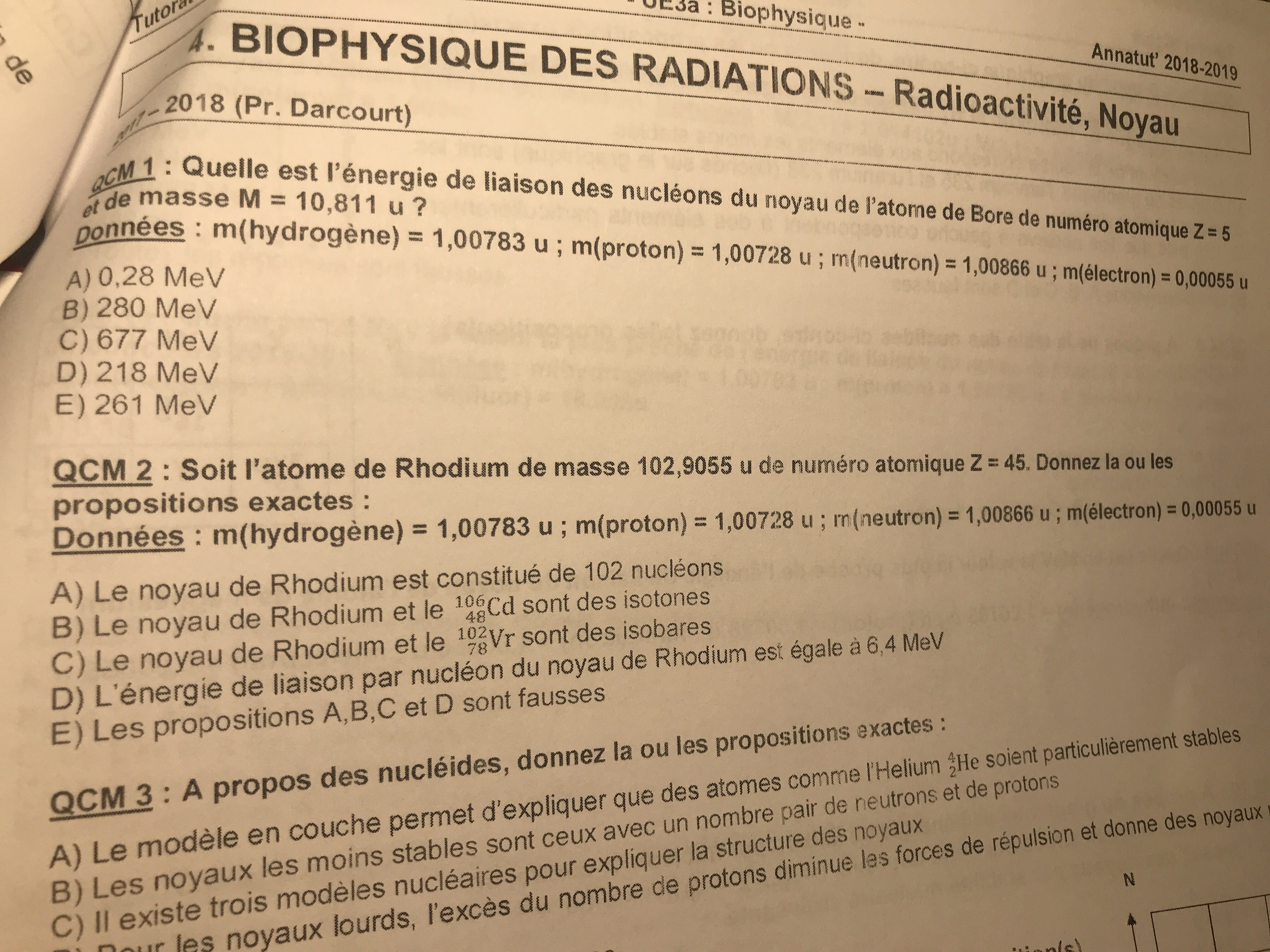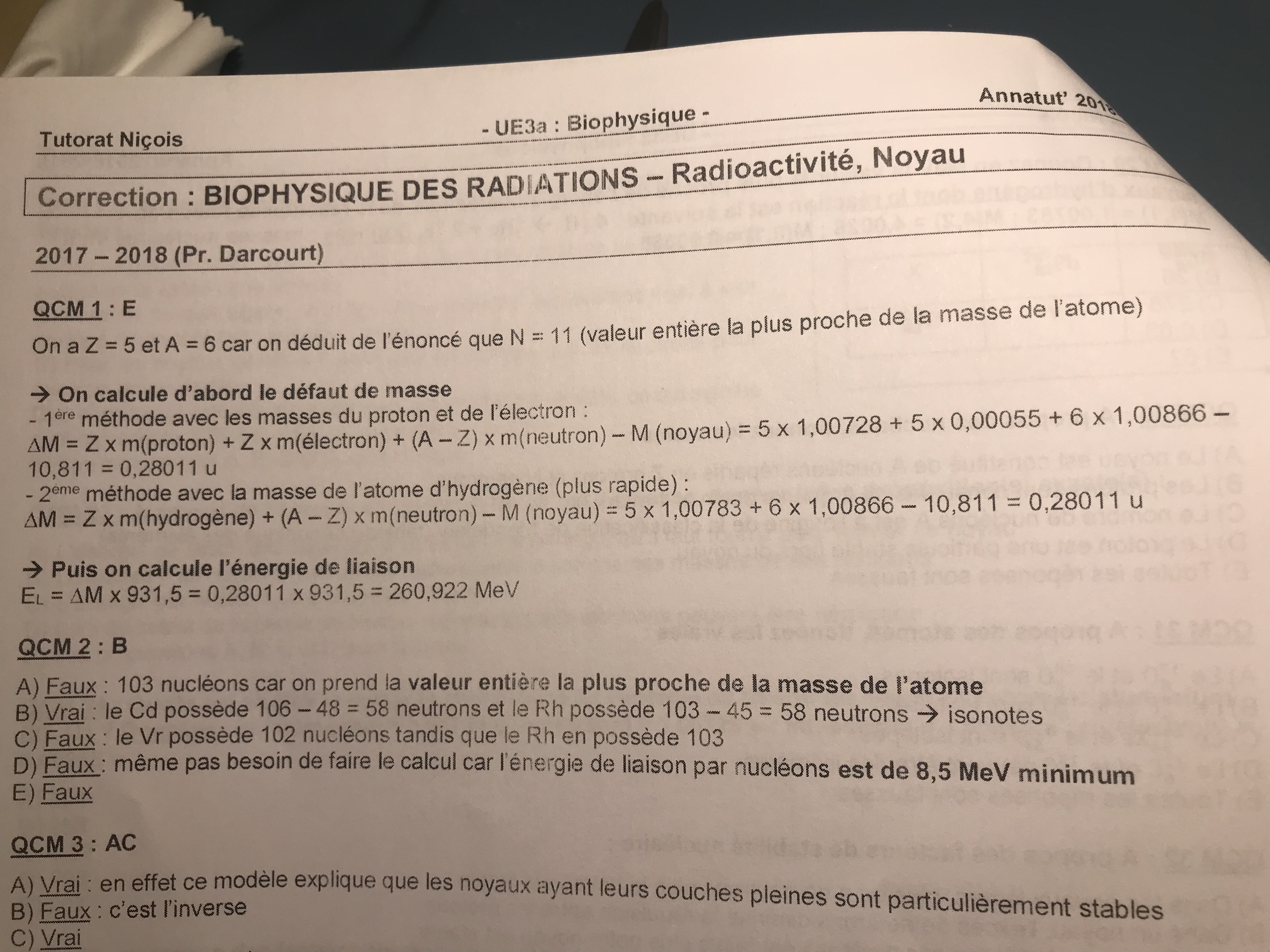 Ce qcm me pose problème et je ne comprends pas. Pk pr calculer le défaut de masse p’ Ne fais Maps Z x mprotons + (A-Z) neutrons -M noyeau