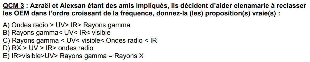 Juste une question pour le qcm 3, j'ai pas trop compris la co ? pour moi pour que AE soit juste faudrait qu'il y ait des < et pas > pcq ducoup là, par ex pour la A on comprend que les ondes radio ont une fréquence plus grande que les rayons UV plus grand que IR etc.. ce qui est faux non, c'est l'inverse ? ou alors j'ai appris le diagramme à l'envers mdrr mais je pense pas pcq justement vous avez mit le diagramme et ca contredit la co aussi non?