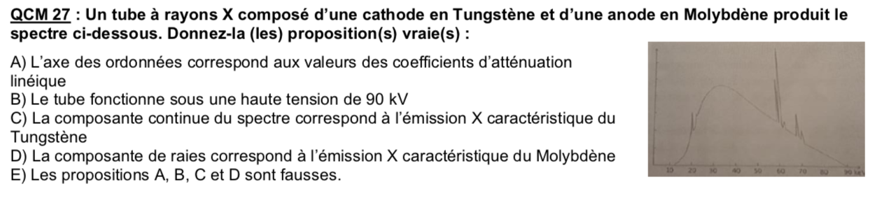 "" La composante continue du spectre correspond à l’émission X caractéristique du Tungstène "" :arrow: faux, de l'anode.