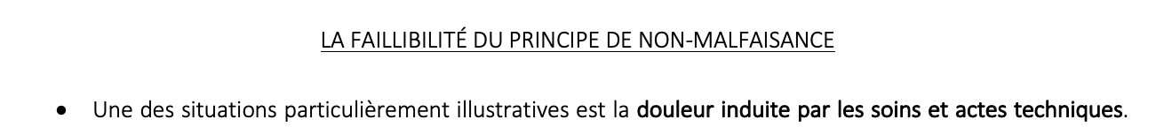 D) On peut s’appuyer sur l’exemple de la prise en charge actuelle de la douleur induite par les soins et actes techniques pour illustrer la faillibilité du principe de non-malfaisance