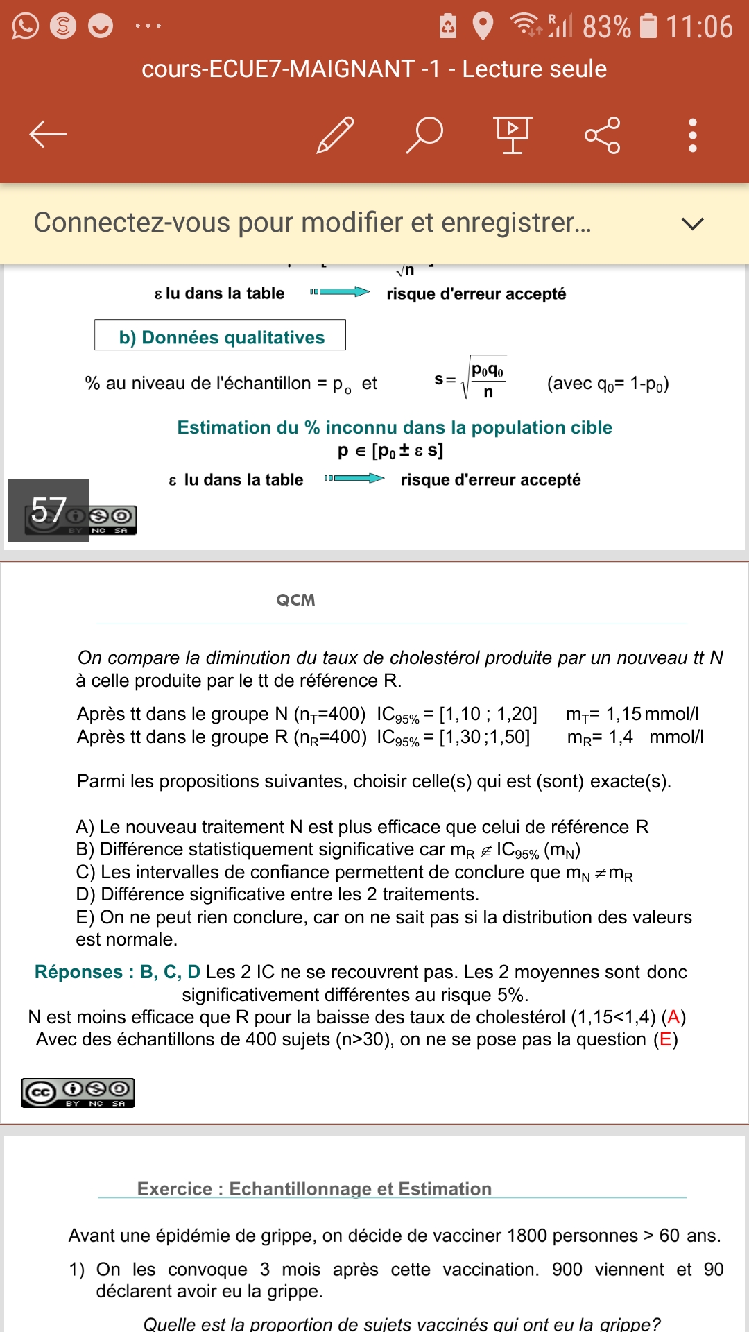 Bonjour, j'ai une question par rapport au cour sorti aujourd'hui en diapo portant sur les statistiques descriptives. Lors d'un exercice sur le diapo 58 du prof concernant une comparaison de l'efficacité de deux traitements N et R (avec une moyenne et un intervalle de confiance) le prof compte vrai l'item B :"il existe une différence statistique significative car mR n'appartient pas à l'intervalle de confiance de mN"