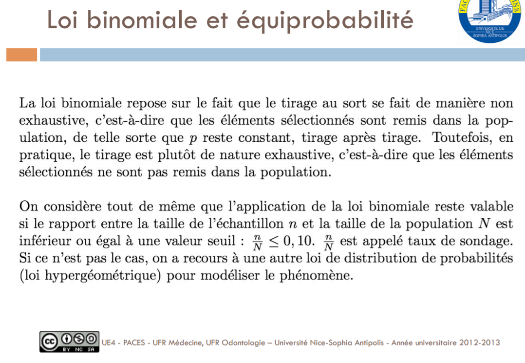 Dans le cours on insiste bien sur la nécessité d'avoir des essais/tirages indépendants pour pouvoir utiliser la loi Binomiale non ? Et donc d'avoir un tirage avec remise ou du moins spécifié comme approchant. Dans ce QRU on nous dit que c'est sans remise donc non-indépendant ! A moins que l'échantillon soit suffisamment grand pour supposer que l'indépendance est conservée malgré le tirage sans remise ?