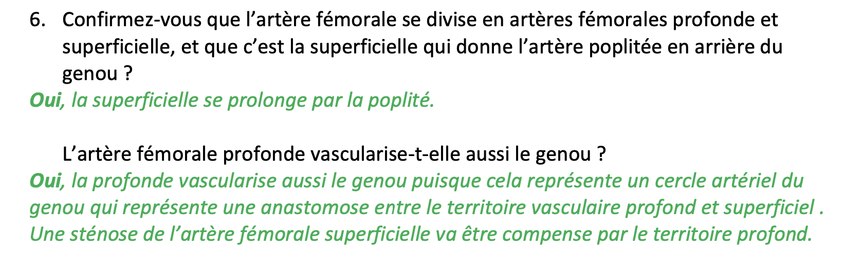 Et ensuite c'était pour avoir une confirmation, l'artère fémorale passe bien devant le fémur, puis quand elle devient poplitée elle passe bien derrière le fémur ?