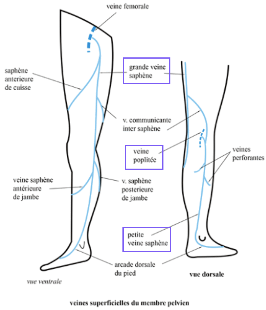 puis page 19 "la veine saphène externe, petite saphène" part de la partie latérale de la jambe remonte le long de la face postérieure et rejoint la veine poplitée"