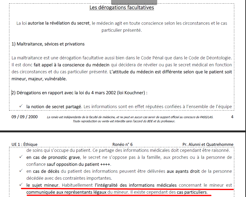 La réponse était AB, mais j'ai du mal avec le l'item B qu'on qualifie ici de dérogations facultatives, les informations médicales sur un sujet mineur ne sont pas Obligatoires envers les parents ?