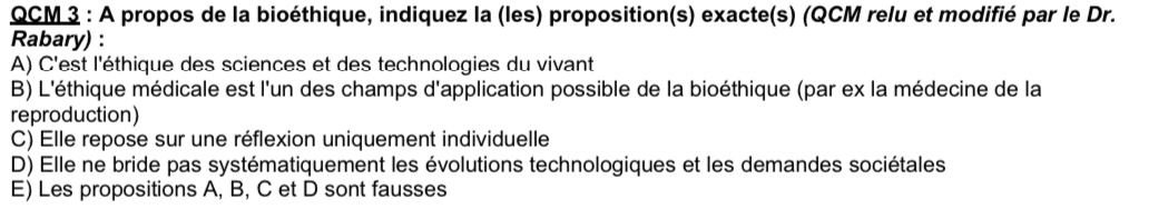 J’ai du mal à comprendre l’item B. J’aurais plutôt dit que c’était l’inverse car dans le cours on nous dit que l’éthique médicale est une éthique appliquée à la bioéthique.