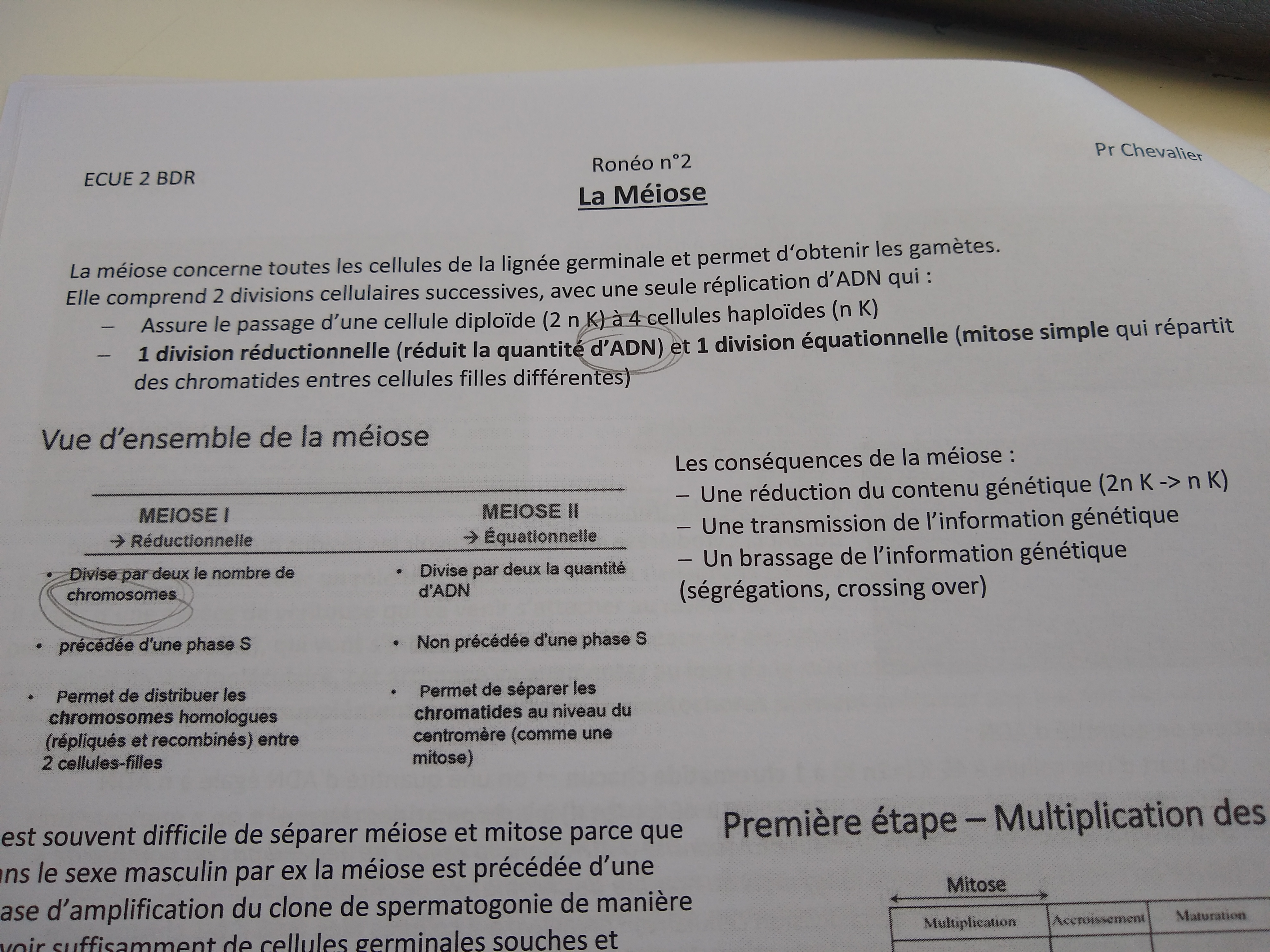 Je voulais savoir s'il y avait une contradiction dans cette partie de la ronéo pour les divisions de la méiose ou si c'était normal. C'est à la p.6 de la ronéo 2. De plus cette page est en contradiction avec ce qui est dit sur le bas de la p.12 de la ronéo 2... Est-ce que ce serait une errata ?