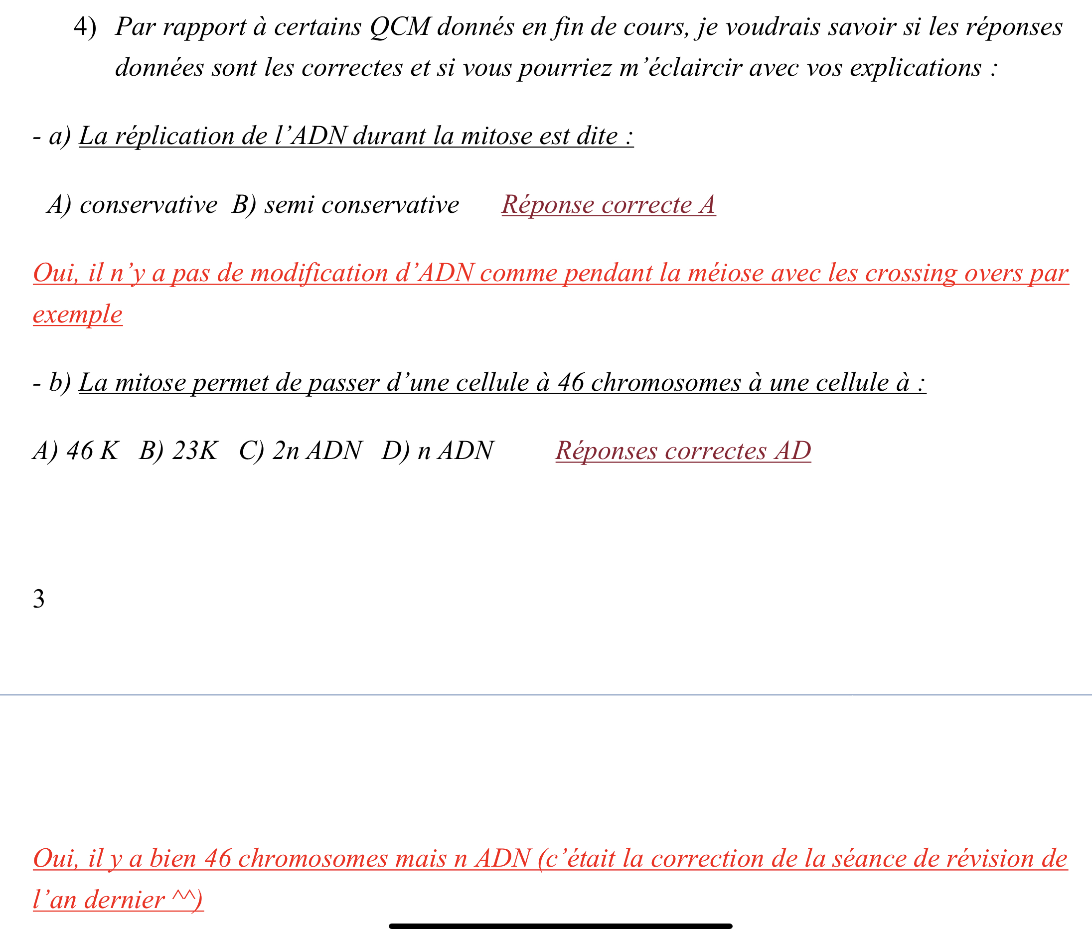 On nous dit que la A est juste mais c’est faux non ? Puisque les bris complémentaires lors que la réplication se basent sur 1 brin parental et pas les 2 et que chaque cellule fille va récupérer un seul brin parental