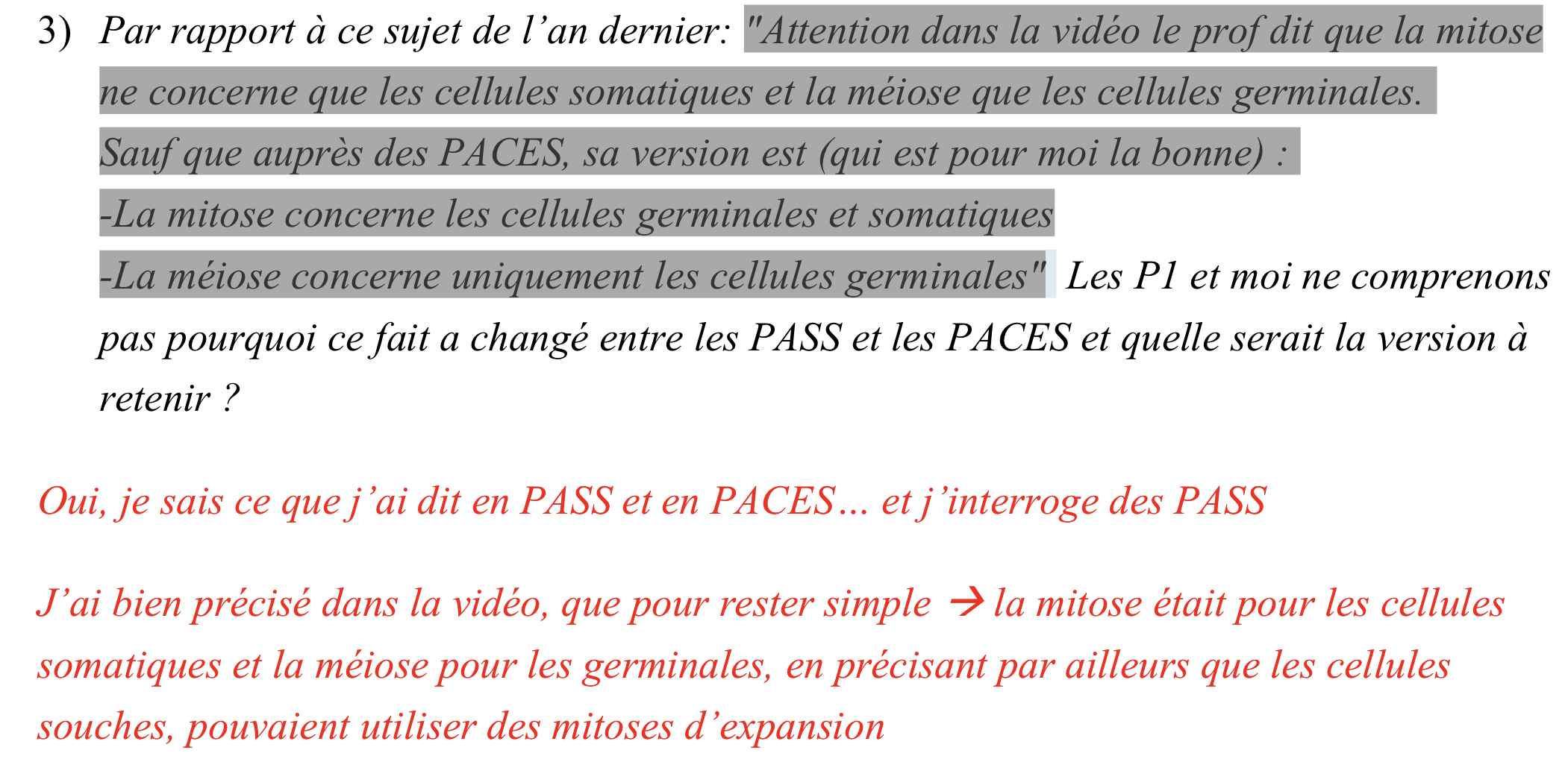 Alors pour moi la réponse correcte et la « vrai réponse » serait celle des PACES. La version qu’il a donné aux PASS serait plus pour moi un abus de langage qu’une vérité en soit. Donc à ta place j’aurai retenu celle où nous sommes d’accord, et je demanderai à nouveau ce qu’il en pense :wink2: