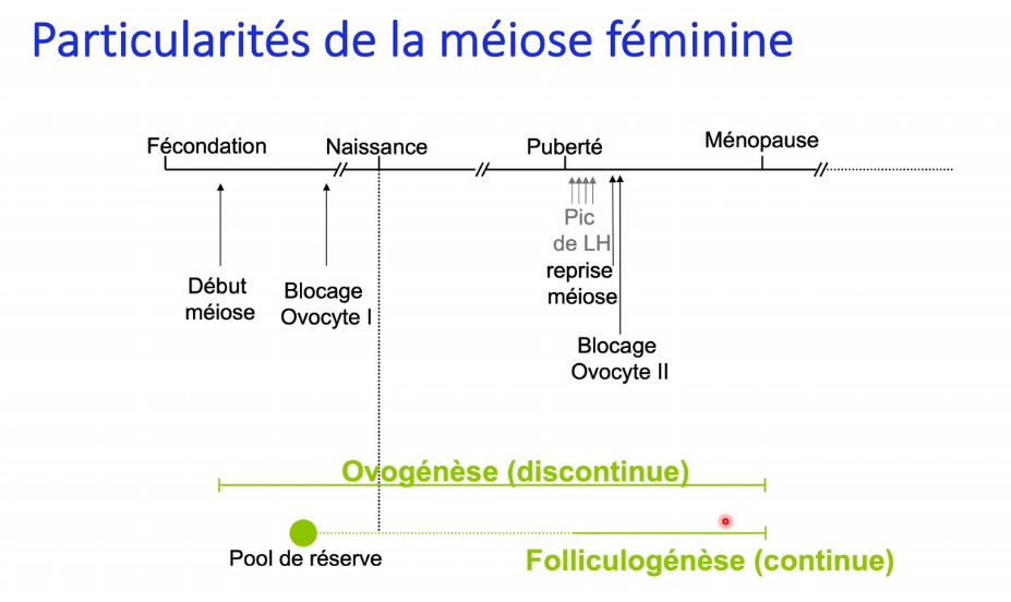 :arrow: A un moment, le stock d'ovocytes va s'épuiser (puisqu'il n'y a pas de pool souche), ça signifie aussi qu'il y aura bcp moins de follicules notamment à cause du phénomène d'atrésie donc les taux hormonaux oestrogéniques/progestatifs vont s'écrouler. Par un rétrocontrôle que tu verras au S2, il y aura moins de production de FSH, donc plus de mal à faire rentrer les follicules en croissance et donc de faire ovuler les follicules... etc etc