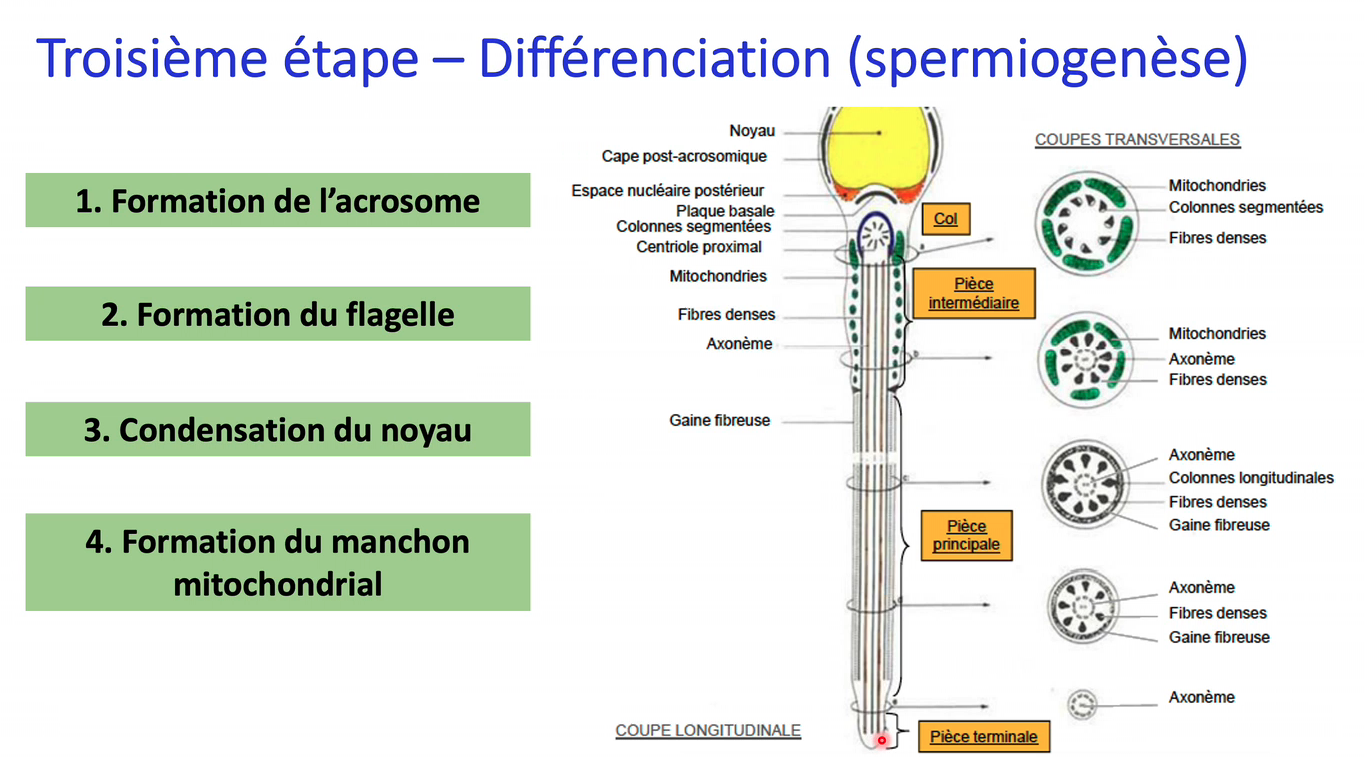 D) Le flagelle du spermatozoïde est entouré de mitochondries au niveau de la pièce intermédiaire et de la pièce principale
