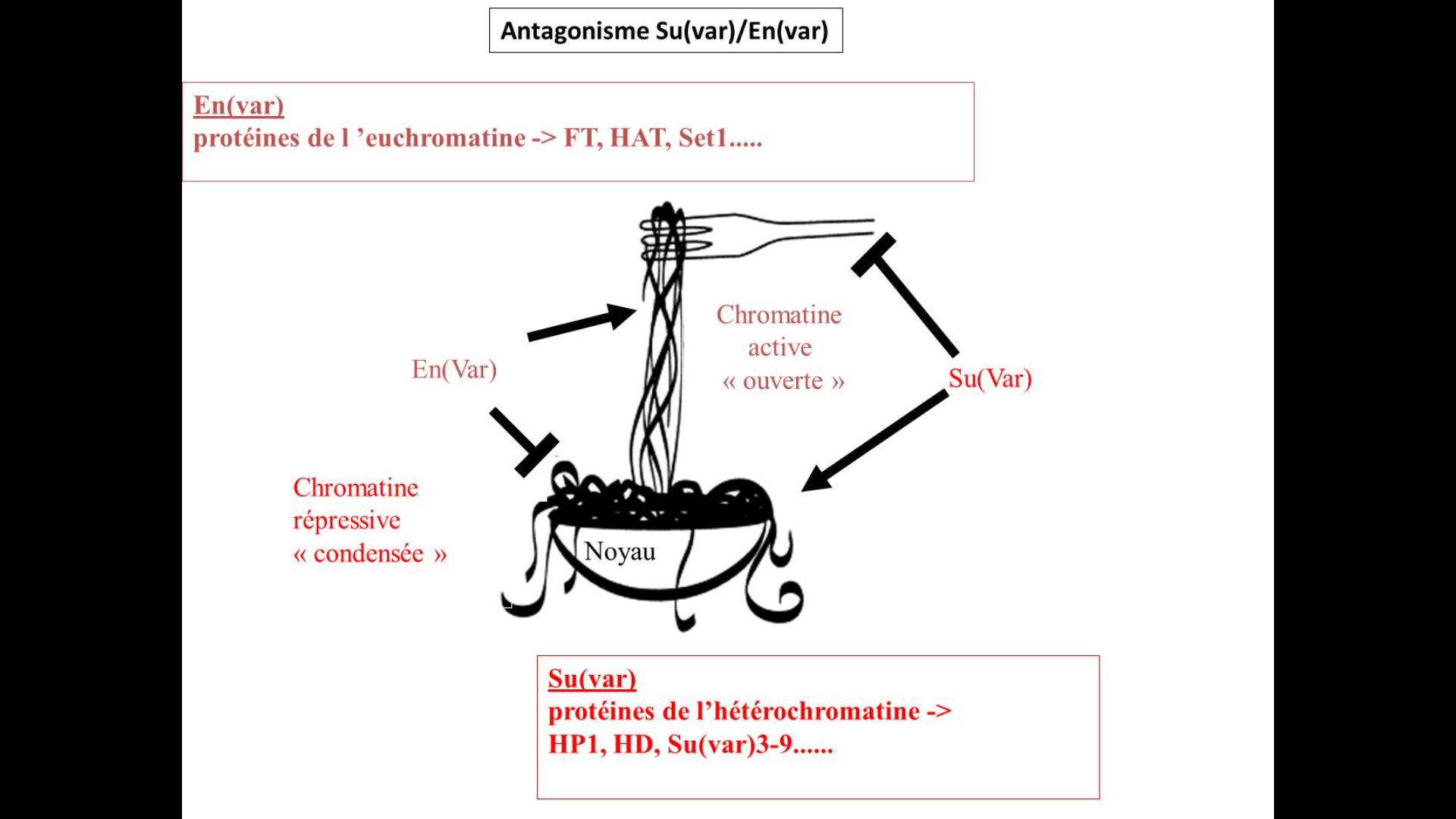 Ici on nous montre que les protéines Su(var) permettent le passage de l'euchromatine à l'hétérochromatine mais j'ai toujours l'impression que ça doit être l'inverse du fait de leur nom et de leur rôle chez les drosophiles.