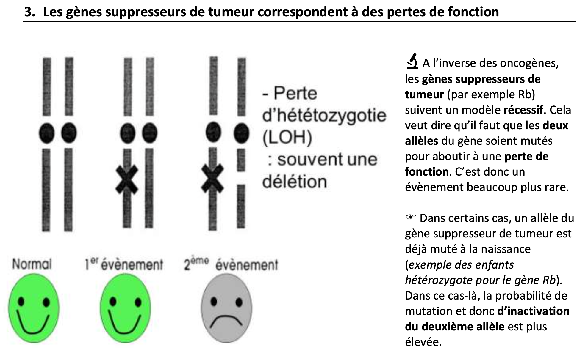 Donc 2 allèles mutées ou 1 délétion + gène muté = oncosupresseur inactif = favorise l'apparition de cancer