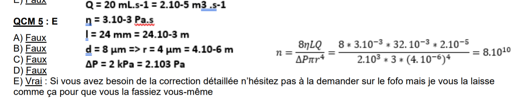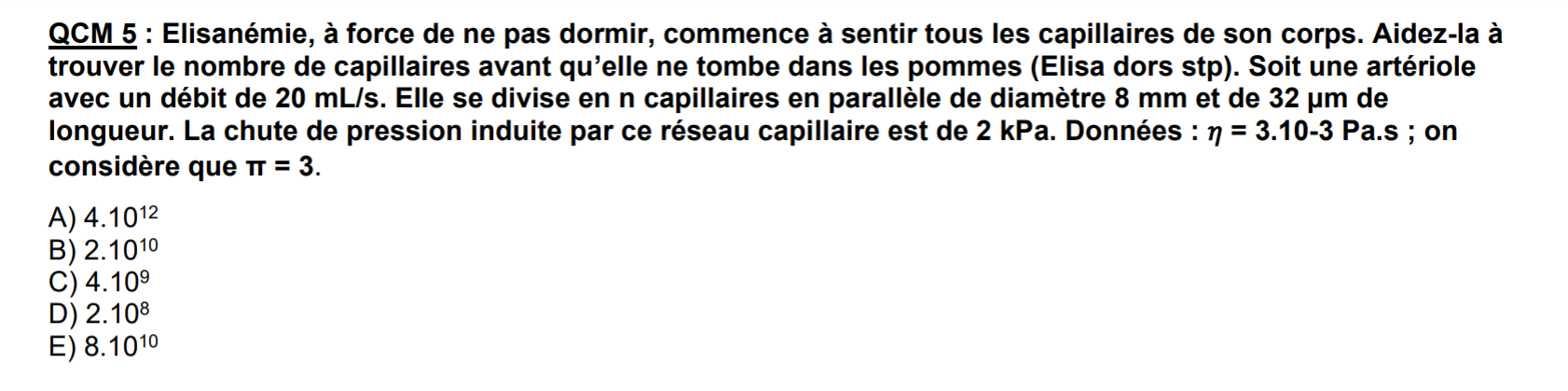 Mais pour le coup en essayant de faire avec les données de l'énoncé je n'arrive vraiment pas à trouver un bon résultat, est ce que c'est possible d'en trouver un bon avec ces valeurs la (celles de l'énoncé) ? Perso je pense que non parce qu'un diamètre de 8mm pour une longeur de 32 micromètre pour un capillaire je crois pas que ce soit possible.